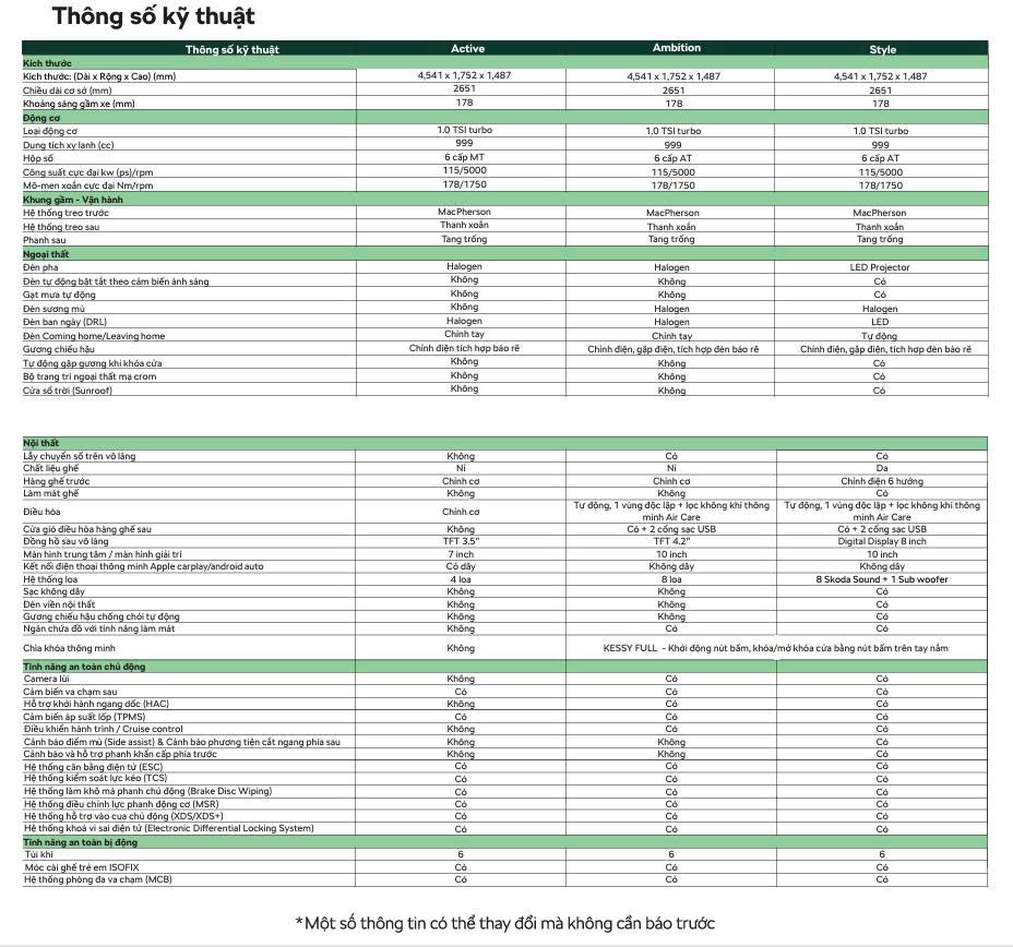 | Hạng Mục | Skoda Slavia Ambition 2026 | Skoda Slavia Style 2026 | |